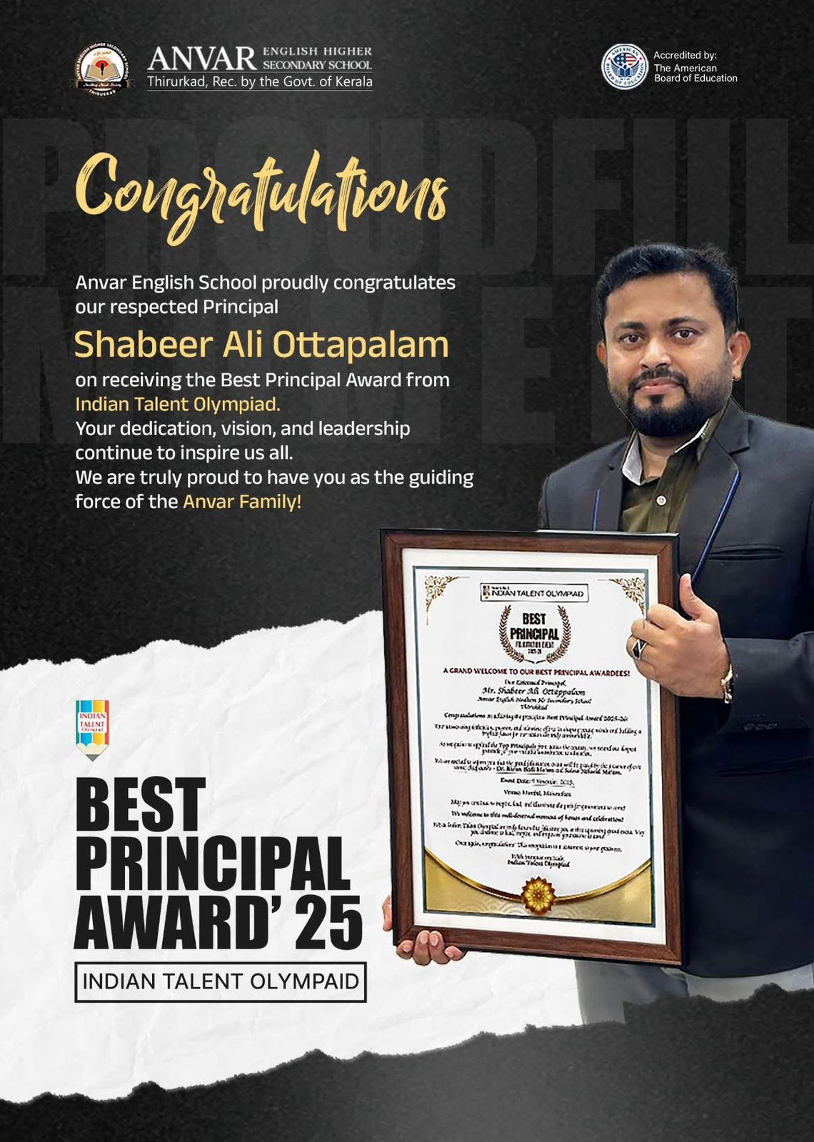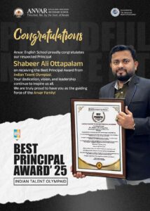 Achieving MA, M.Ed, IELTS and several academic milestones by the age of 36, Shabeer Ali Ottapalam stands as a symbol of hard work, vision, and lifelong learning. His leadership continues to elevate the standards of Anvar School, fostering a culture of excellence, character, and global readiness.